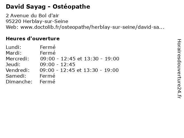 | Mercredi | 09:00-12:45 et 13:30-19:00 |