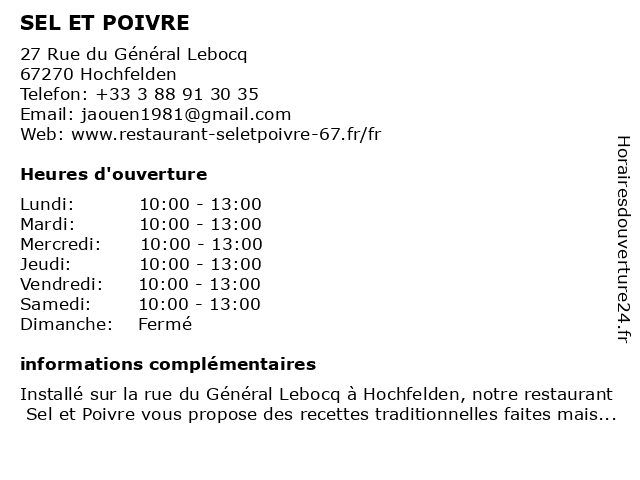 | Dimanche | Fermé |