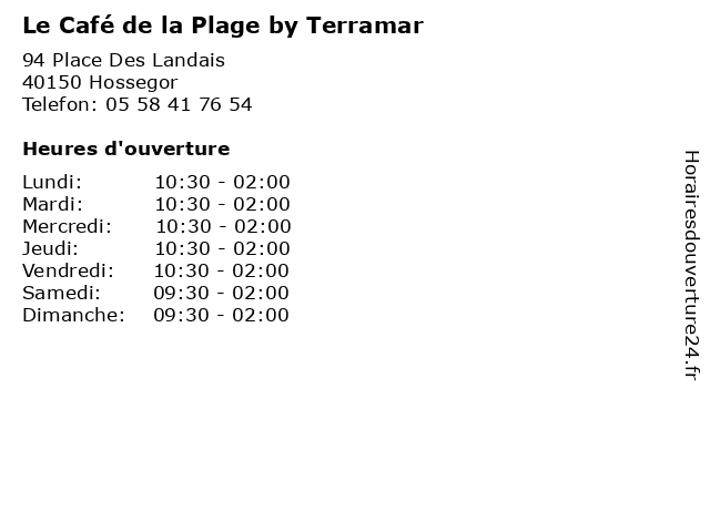 1 Blue Café (Distance: 0,02 km) 48 Place des Landais, 40150 Soorts Hossegor bar, bistro, bistrot, blue, brasserie, café, pub, restaurant, restauration, resto 2 Hôtel De La Plage (Distance: 0,04 km) 69 Avenue des Hippocampes, 40150 Soorts-Hossegor de, hôtel, la, plage 3 Café Bleu (Distance: 1,17 km) 74 Avenue Paul Lahary, 40150 Soorts-Hossegor barnat, bleu, brasserie, cafe, café, restaurants 4 Belharra Café (Distance: 1,19 km) - Boulevard François Mitterrand (, 40130 Capbreton bar, belharra, bistro, bistrot, brasserie, café, pub, restaurant, restauration, resto 5 Le Touring Café (Distance: 1,23 km) 515 Avenue du Touring Club, 40150 Soorts Hossegor bar, bistro, bistrot, brasserie, café, le, restaurant, restauration, touring 6 Café Vintage Avenue (Distance: 1,28 km) 366 Avenue du Touring Club de France, 40150 Soorts-Hossegor avenue, bar, brasserie, café, restaurant, traditionnel, vintage |