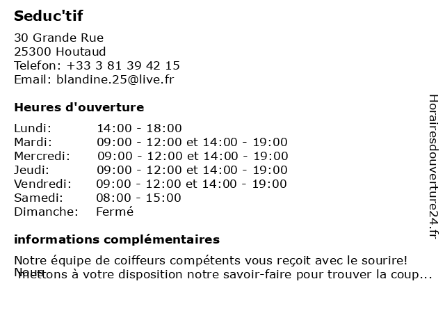 1 Séduc'tif (Distance: 0,51 km) 1 Rue des Ravières, 25300 Dommartin beauté, coiffure, coiffures, coloristes, séduc'tif 2 Tif & Touf Canin (Distance: 35,53 km) - Chemin du Montailloux, 25440 Le Val bain, canin, chien, soin, tif, toilettage, touf |