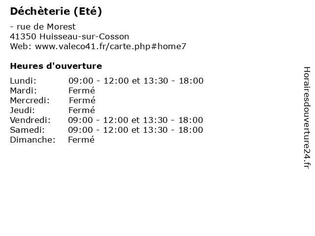 1 Déchèterie (Eté) (Distance: 3,17 km) - Chemin du Buisson des Blés, 41250 Mont-près-Chambord débarras, déchets, déchèterie, eté, poubelles, été 2 Déchèterie (Eté) (Distance: 4,02 km) - route de Saint-Dyé, 41350 Montlivault débarras, déchets, déchèterie, eté, poubelles, été 3 Déchèterie (Hiver) (Distance: 0,00 km) - rue de Morest, 41350 Huisseau-sur-Cosson débarras, déchets, déchèterie, hiver, poubelles 4 Déchèterie (Hiver) (Distance: 4,02 km) - route de Saint-Dyé, 41350 Montlivault débarras, déchets, déchèterie, hiver, poubelles 5 Déchèterie (Distance: 8,18 km) - Le Verger, 79130 Neuvy-Bouin déchèterie, gravats, huiles usées, la réception des déchets et écocentres, les appareils électroménagers, les déchets verts, papier et carton en quantité 6 Déchèterie (Distance: 9,34 km) - Chemin de Charlemagne, 41120 Cellettes débarras, déchets, déchèterie, poubelles |