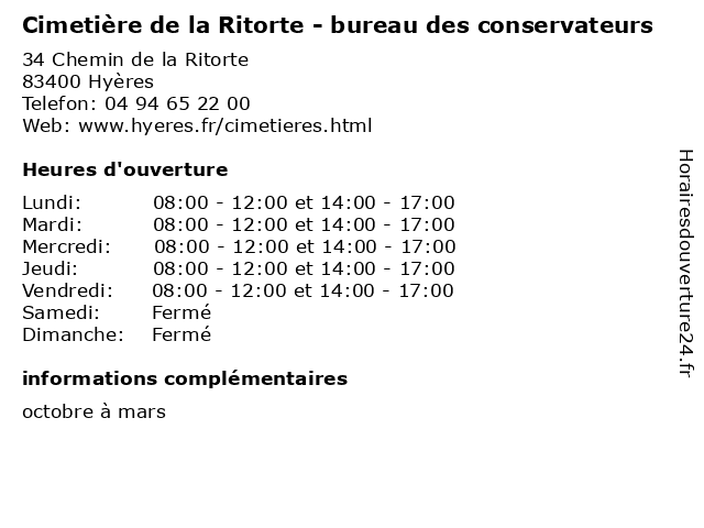 1 Cimetière de la Ritorte (Janvier, Février, Mars, Novembre, Décembre) (Distance: 0,00 km) 34 Chemin de la Ritorte, 83400 Hyères arbre, cimetiere, cimetière, de, décembre, espace vert, forêt, funeraire, février, janvier, jardin, la, loisirs, mars, nature, novembre, parc, prairie, ritorte, square 2 Cimetière du Levant (Janvier, Février, Mars, Novembre, Décembre) (Distance: 0,13 km) - Chemin de la Ritorte, 83400 Hyères arbre, cimetiere, cimetière, du, décembre, espace vert, forêt, funeraire, février, janvier, jardin, levant, loisirs, mars, nature, novembre, parc, prairie, square 3 Cimetière de Sauvebonne (Mai, Septembre) (Distance: 5,88 km) - Vallée de Sauvebonne, 83400 Hyères arbre, cimetiere, cimetière, de, espace vert, forêt, funeraire, jardin, loisirs, mai, nature, parc, prairie, sauvebonne, septembre, square 4 Cimetière de Sauvebonne (Juin-Aout) (Distance: 5,88 km) - Vallée de Sauvebonne, 83400 Hyères aout, arbre, cimetiere, cimetière, de, espace vert, forêt, funeraire, jardin, juin, loisirs, nature, parc, prairie, sauvebonne, square 5 Cimetière de Sauvebonne (Octobre) (Distance: 5,88 km) - Vallée de Sauvebonne, 83400 Hyères arbre, cimetiere, cimetière, de, espace vert, forêt, funeraire, jardin, loisirs, nature, octobre, parc, prairie, sauvebonne, square 6 Cimetière de Porquerolles (Janvier, Février, Mars, Novembre, Décembre) (Distance: 16,71 km) - Route du Phare, 83400 Hyères arbre, cimetiere, cimetière, de, décembre, espace vert, forêt, funeraire, février, janvier, jardin, loisirs, mars, nature, novembre, parc, porquerolles, prairie, square |