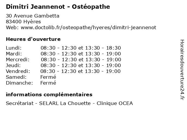 | Jeudi | 08:30-12:30 et 13:30-19:00 |
