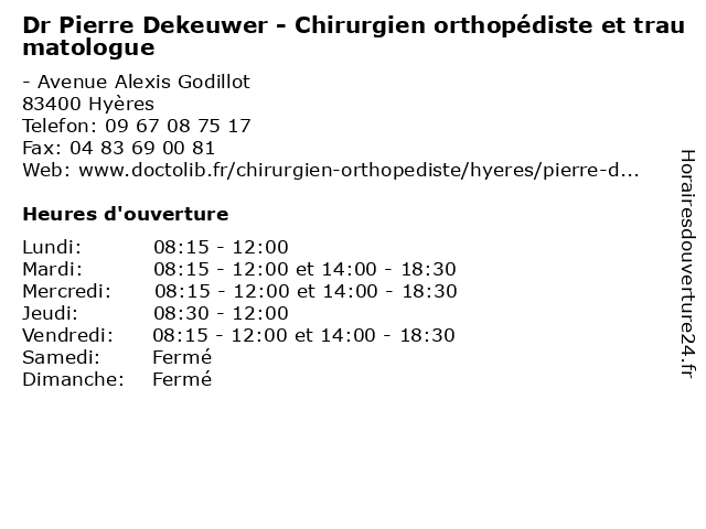 | Vendredi | 08:15-12:00 et 14:00-18:30 |