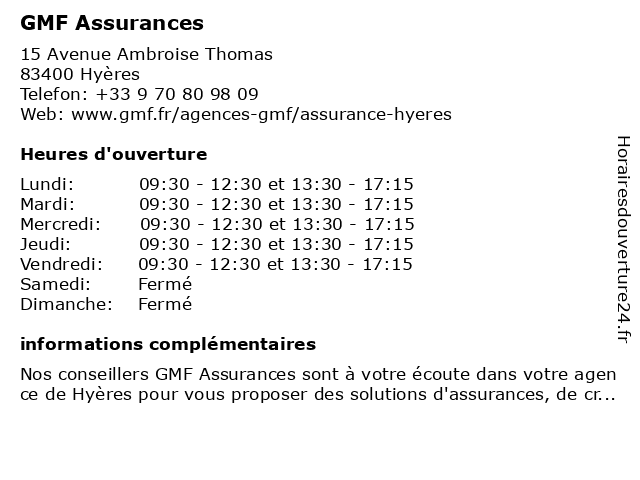 1 GMF Assurances (Distance: 10,93 km) 245 Avenue de l'Université, 83160 La Valette-du-Var assurance auto, assurance habitation, assurance santé, assurances, crédit, devis en ligne, gmf, prise de rendez-vous, prévoyance, épargne 2 GMF Assurances (Distance: 16,69 km) 85 Avenue Vauban, 83000 Toulon assurance auto, assurance habitation, assurance santé, assurances, crédit, devis en ligne, gmf, prise de rendez-vous, prévoyance, épargne 3 Mascotte Assurances (Distance: 0,31 km) 12 rue de Provence, 83400 Hyères agence, assurance, assurances, courtage, finance, mascotte, placements 5 MMA Assurances HYERES PROVENCE (Distance: 0,37 km) 3 Rue de Provence, 83400 Hyères assurance au tiers, assurance auto, assurance auto au tiers, assurance auto pas cher, assurance auto tous risques, assurance habitation, assurance habitation pas cher, assurance local, assurance multirisque, assurance professionnelle, assurance santé, assurance tous risques, assurance voiture, assurances, flotte, garantie décennale, hyeres, mma, mutuelle, mutuelle sénior, provence, rc pro, responsabilité civile 6 GAN ASSURANCES HYERES MASSILLON (Distance: 0,37 km) 2 Avenue du 8 Mai, 83400 Hyères assurances, gan, hyeres, massillon |