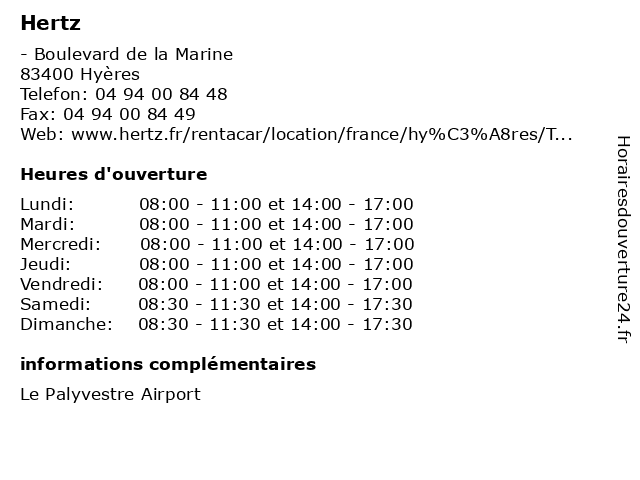 1 Hertz (Distance: 17,09 km) n/a Rue Auguste Renoir, 83980 Le Lavandou hertz, location de voitures, location longue durée, voiture, véhicules 2 Hertz (Distance: 18,11 km) 60 Avenue François Cuzin, 83100 Toulon hertz, location de voitures, location longue durée, voiture, véhicules 4 Station service BP Zerafa - Agence Hertz (Distance: 3,83 km) 2 Avenue du 15ème Corps, 83400 Hyères agence, bp, hertz, service, station, zerafa 5 Hertz - Garage Batailler (Distance: 16,24 km) 22 rue Saint Pons, 83980 Le Lavandou agence, batailler, garage, hertz, location, voiture 6 Hertz Trois Soleils (Distance: 26,10 km) 1031 chemin des Négadoux, 83140 Six Fours les Plages agence, camping cars, hertz, location, services, soleils, trois, vacances, voyages |