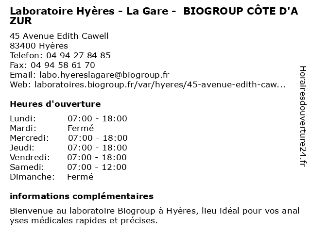 Termes de recherche pour Laboratoire Hyères - La Gare - BIOGROUP CÔTE D'AZUR:la, gare, laboratoire, cote, hyéres, d'azur, biogroup, dépistages, laboratoire de diagnostic |