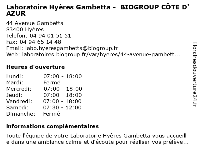 Termes de recherche pour Laboratoire Hyères Gambetta - BIOGROUP CÔTE D'AZUR:laboratoire, gambetta, cote, hyéres, d'azur, biogroup, dépistages, laboratoire de diagnostic |