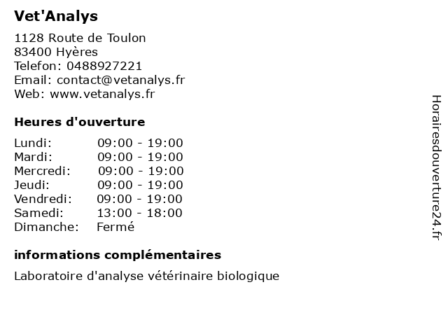 1 Clinique Vétérinaire Telo Vet (Distance: 11,88 km) 440 Avenue François Cuzin, 83000 Toulon clinique, telo, vet, vétérinaire 2 Eurofins - Laboratoire d'analyses médicales La Moutonne La Crau (Distance: 1,55 km) 397 Chemin de l'Estagnol, 83260 La Crau crau, d'analyses, eurofins, la, laboratoire, moutonne, médicales 3 Laboratoire d'analyses médicales - La Crau - Cerballiance (Distance: 2,97 km) 16 Avenue General De Gaulle, 83260 La Crau cerballiance, crau, d'analyses, dépistages, la, laboratoire, médicales 4 Laboratoire d'analyses médicales - La Garde - Cerballiance (Distance: 6,55 km) 105 Montee Du Thouar Res Sainte, 83130 La Garde cerballiance, d'analyses, dépistages, garde, la, laboratoire, médicales 5 CH Toulon - Biologie Médicale (Distance: 9,55 km) 54 Rue Henri Sainte Claire Deville, 83000 Toulon biologie, bureau, ch, consultation, dr, maladie, med, médecin, médecine, médicale, pratique, thérapie, toulon, traitement 6 A.V.A.C Assist Varoise Animale et Crémation (Distance: 11,64 km) 19 Rue de la Création, 83390 Cuers a.v.a.c, animale, assist, crémation, et, varoise |