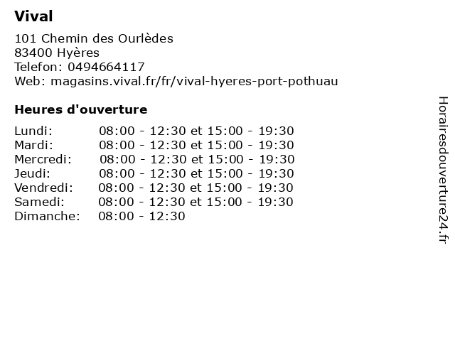 1 Vival (Distance: 4,15 km) 63 Avenue Alphonse Denis, 83400 Hyères droguerie, d’hypermarchés, frais, fruits et légumes, hygiène, parfumerie et autres produits non alimentaires., surgelés, vival, épicerie 2 Vival (Distance: 4,58 km) - Quai Claude Meiffret, 83370 Hyères droguerie, d’hypermarchés, frais, fruits et légumes, hygiène, parfumerie et autres produits non alimentaires., surgelés, vival, épicerie 3 Vival (Distance: 4,60 km) 2 Avenue Georges Clemenceau, 83250 La Londe Les Maures droguerie, d’hypermarchés, frais, fruits et légumes, hygiène, parfumerie et autres produits non alimentaires., surgelés, vival, épicerie 4 Vival (Distance: 4,62 km) 20 Avenue Gambetta, 83400 Hyères alimentaire, discount, distributeur, distribution, fruits, grande, hypermarché, légumes, supermarché, vival, épicerie 5 Vival (Distance: 4,95 km) - Avenue de la Baie des Îles, 83250 La-Londe-les-Maures alimentation, by, casino, distributeur alimentaire, supermarché, supérette, vival, épicerie 6 Vival (Distance: 5,08 km) 2947 Route de Giens, 83400 Hyères alimentation, distributeur alimentaire, supermarché, supérette, vival, épicerie |