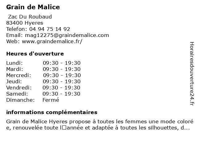 2 Grain de Malice - Fermé (Distance: 1,80 km) 3 Avenue Du Général De Gaulle, 83400 Hyeres de, fermé, grain, malice 3 GDM Grain de Malice (Distance: 10,15 km) 98 RN, 83160 La Valette du Var boutique, de, femmes, gdm, grain, hommes, malice, mode, shopping, shopping center 4 Les Thés Du Monde (Distance: 14,27 km) 26 Rue Pierre Semard, 83000 Toulon boutique, du, grain, les, monde, thés, tisanes, vrac 5 Le Grain de Sel (Distance: 20,62 km) - Boulevard du Front de Mer, 83230 Bormes-les-Mimosas de, grain, le, pieds, plat, restaurants, sel 6 Grain De Sel (Distance: 37,67 km) 6 Rue Du 11 Novembre 1918, 83310 Cogolin boissons, de, grain, restaurants, sel |