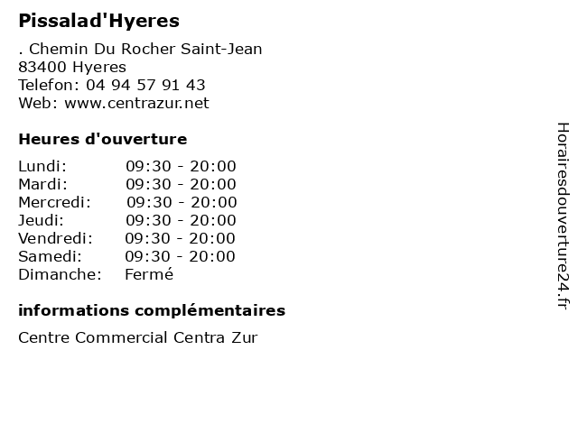 1 Pissalad' Hyéres (Distance: 1,33 km) - Chemin du Rocher Saint-Jean, 83400 Hyères fast-food, hyéres, pissalad', restauration, restauration rapide 2 5 à SEC (Distance: 0,00 km) . Chemin Du Rocher Saint-Jean, 83400 Hyeres cafe, chaussures, enfants, homme, lingerie, mode femme, restaurant, sec, service 3 Calzedonia (Distance: 0,00 km) . Chemin Du Rocher Saint-Jean, 83400 Hyeres cafe, calzedonia, chaussures, enfants, homme, lingerie, mode femme, restaurant, service 4 Christine Laura (Distance: 0,00 km) . Chemin Du Rocher Saint-Jean, 83400 Hyeres cafe, chaussures, christine, enfants, homme, laura, lingerie, mode femme, restaurant, service 5 Claire's (Distance: 0,00 km) . Chemin Du Rocher Saint-Jean, 83400 Hyeres cafe, chaussures, claire's, enfants, homme, lingerie, mode femme, restaurant, service 6 Comptoirs Casino (Distance: 0,00 km) . Chemin Du Rocher Saint-Jean, 83400 Hyeres cafe, casino, chaussures, comptoirs, enfants, homme, lingerie, mode femme, restaurant, service |