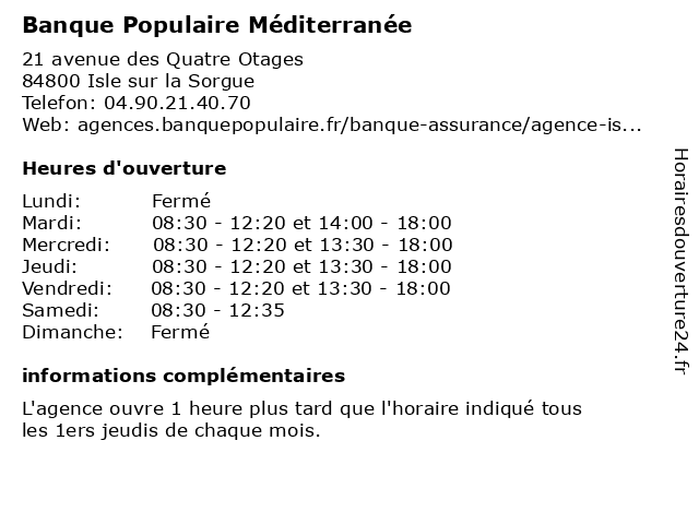 1 Banque Populaire Méditerranée (Distance: 0,24 km) 23 bis quai Rouget de Lisle, 84800 Isle sur la Sorgue banque, méditerranée, populaire 2 Banque Populaire Méditerranée (Distance: 8,86 km) 1 chemin des Coudoulets, 84210 Pernes les Fontaines banque, méditerranée, populaire 3 Banque Populaire Méditerranée (Distance: 8,92 km) 204 cours Gambetta, 84300 Cavaillon banque, méditerranée, populaire 4 Banque Populaire Méditerranée (Distance: 14,60 km) 196 Cours Cardinal Bertrand, 84140 Montfavet banque, méditerranée, populaire 5 Banque Populaire Méditerranée (Distance: 15,15 km) 7 Place Général de Gaulle, 84200 Carpentras banque, méditerranée, populaire 6 Banque Populaire Méditerranée (Distance: 15,20 km) 53 Place Général de Gaulle, 84200 Carpentras banque, méditerranée, populaire |