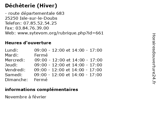 1 Déchèterie (Hiver) (Distance: 6,84 km) - lieu-dit des Combes de Fontaine, 25340 Clerval bennes, débarras, déchèterie, détritus, hiver, ordures 2 Déchèterie (Hiver) (Distance: 7,94 km) - rue Saint Maurice, 25260 Colombier-Fontaine bennes, débarras, déchèterie, détritus, hiver, ordures 3 Déchèterie (Hiver) (Distance: 10,54 km) - rte d'Echenans, 25750 Désandans bennes, débarras, déchèterie, détritus, hiver, ordures, poubelles 4 Déchèterie (Hiver) (Distance: 11,39 km) - lieu-dit sur le Tartre, 25430 Vellerot-lès-Belvoir bennes, débarras, déchèterie, détritus, hiver, ordures 5 Déchèterie (Hiver) (Distance: 16,34 km) - lieu-dit Devant-les-Cuisottes, 25680 Rougemont bennes, débarras, déchèterie, détritus, hiver, ordures 6 Déchèterie (Hiver) (Distance: 17,28 km) 38 Boulevard du 21eme Bataillon de Chasseurs À Pied, 25200 Montbéliard bennes, débarras, déchèterie, détritus, hiver, ordures |