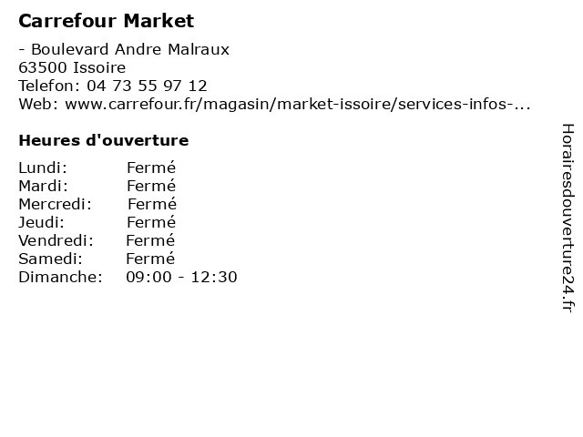 1 Carrefour Contact (Distance: 0,27 km) 62-64 Avenue du Général de Gaulle, 81500 Lavaur carrefour, contact, electrical appliances, furnitures, garden equipment, shelving 2 Carrefour Banque (Distance: 1,54 km) - Rue Jean Bigot, 63500 Issoire assurances, banque, carrefour, services 3 Carrefour Station Service (Distance: 1,87 km) . Rue Jean Bigot, 63500 Issoire automobiles, carrefour, oil, service, services, station, stations essences 4 Carrefour Drive (Distance: 1,87 km) . Rue Jean Bigot, 63500 Issoire carrefour, drive, hypermarche, marche, market 5 Carrefour (Distance: 2,02 km) - rue Jean Bigot, 63500 Issoire alimentation, carrefour, fruits, légumes, supermarché, épicerie 6 Carrefour Contact (Distance: 9,70 km) 9 Route d'Issoire, 63490 Sauxillanges alimentation, carrefour, contact, magasin discount, market, supermarché |