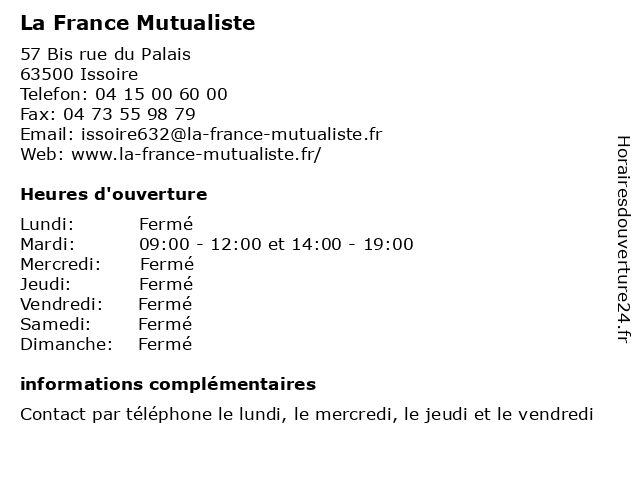 | Mardi | 09:00-12:00 et 14:00-19:00 |