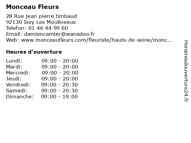 2 Monceau Fleurs (Distance: 2,38 km) 36 Rue Gabriel Péri, 92140 Clamart boutique, fleuriste, fleurs, monceau 4 Monceau Fleurs (Distance: 5,59 km) 58 Avenue Aristide Briand, 92120 Montrouge artisan, compositions, fleuriste, fleurs, florales, monceau 5 Monceau Fleurs (Distance: 6,98 km) 79 Boulevard de la République, 92430 Marnes-la-Coquette bouquet, cadeaux, fleur, fleuriste, fleurs, les deuil, mariage, monceau, plante, un service 6 |
