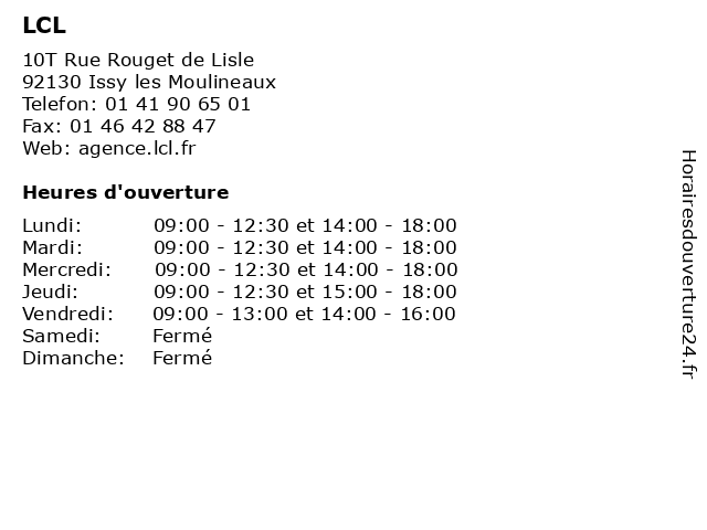 1 LCL (Distance: 1,06 km) 190 Avenue de Versailles, 75016 Paris agence, assurance, bancaire, banque, lcl 2 LCL (Distance: 1,09 km) 63 Rue Du General Leclerc, 92130 Issy Les Moulineaux banque, crédit, lcl, service 4 LCL (Distance: 1,38 km) 2 Avenue du Général Leclerc, 92100 Boulogne-Billancourt agence, assurance, bancaire, banque, lcl 6 |
