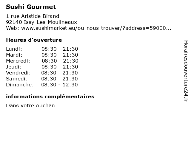 1 Sushi Gourmet (Distance: 0,09 km) 1 Rue Aristide Briand, 92130 Issy-les-Moulineaux bistrot, gourmet, restaurant, sushi 2 Sushi Gourmet (Distance: 4,03 km) Sushi Gourmet Chez Chem Department 110, 78200 Buchelay gourmet, mantes, restaurants, sushi 3 Sushi Gourmet (Distance: 4,03 km) Sushi Gourmet Cc Pariwest Chez Auchan, 78310 Maurepas gourmet, maurepas, restaurants, sushi 4 Sushi Gourmet (Distance: 4,03 km) Sushi Gourmet Chez Auchan, 84140 Avignon avignon, gourmet, restaurants, sushi 5 Sushi Gourmet (Distance: 4,03 km) Sushi Gourmet Chez Auchan, 95520 Osny gourmet, oseraie, osny, restaurants, sushi 6 |