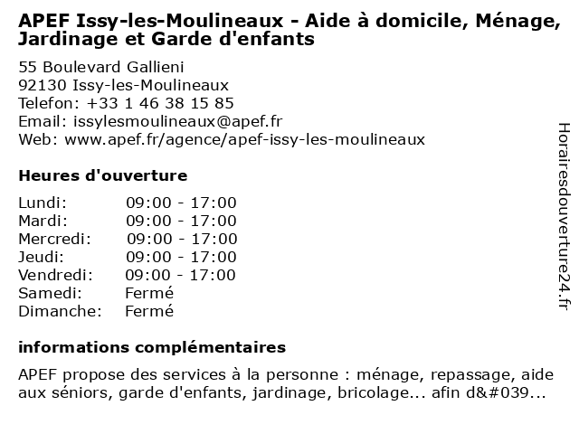 1 Kangourou Kids | Agence de garde d'enfants (Distance: 0,25 km) 10 Mail Raymond Menand, 92130 Issy-les-Moulineaux agence, babysitter, babysitting, d'enfants, de, garde, garde enfant, garde enfant a domicile, kangourou, kids, nounou, sortie ecole 2 Ménage et repassage à domicile - Shiva Issy les Moulineaux (Distance: 0,34 km) 29 Rue Diderot, 92130 Issy-les-Moulineaux domicile, et, issy, les, moulineaux, ménage, repassage, shiva 3 APEV - Aide aux Parents d'Enfants Victimes (Distance: 0,34 km) 3 rue Edouard Branly, 92130 Issy-les-Moulineaux aide, apev, association, aux, d'enfants, enfants, parents, victimes 5 Crèche People and Baby - Histoire d'enfants (Distance: 2,27 km) 67 Allée Georges Askinazi, 92100 Boulogne-Billancourt and, baby, crèche, crèches, d'enfants, garde d'enfants, histoire, les services parentalité, people, projet social, projet éducatif 6 Ménage et repassage à domicile - Shiva Clamart (Distance: 2,37 km) 59 Avenue Jean Jaurès, 92140 Clamart clamart, domicile, et, ménage, repassage, shiva |