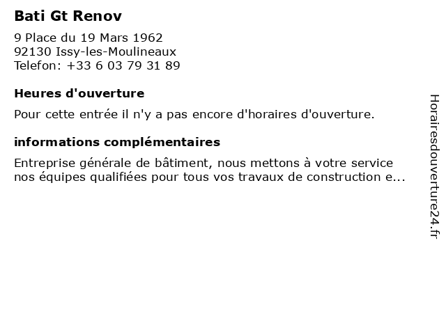2 Bati-Grès Matériaux (Distance: 7,13 km) 10 Rue du Docteur Christen, 92420 Vaucresson bati, carrelages, de dallages, grès, matériaux 3 GT Optique (Distance: 8,42 km) 21 rue de Rome, 75008 Paris gt, lunettes, monture, opticien, optique, solaire, vue 5 Home Bati Services (Distance: 9,14 km) 12 Avenue Maurice Thorez, 94200 Ivry-sur-Seine bati, home, services 6 Bati Décors (Distance: 9,24 km) 42 rue de Patay, 75013 Paris bati, décoration, décors, matériel, outillages, peintures, pose, travaux |