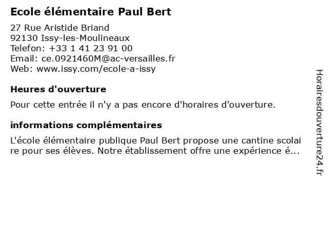1 École maternelle publique Paul Bert (Distance: 0,12 km) 18 Rue Paul Bert, 92130 Issy-les-Moulineaux bert, cours, education, maternelle, paul, publique, services, École, école 2 École élémentaire publique Pierre Grenier (Distance: 0,95 km) 29 Avenue Pierre Grenier, 92100 Boulogne-Billancourt cours, grenier, pierre, publique, servicios, école, élémentaire 3 Ecole élémentaire Jean La Fontaine (Distance: 1,63 km) 17 Rue de l'Abbé Derry, 92130 Issy-les-Moulineaux ecole, fontaine, jean, la, élémentaire 4 École élémentaire application Murat (Distance: 2,03 km) 162 boulevard Murat, 75016 Paris application, cours, murat, servicios, école, élémentaire 5 École élémentaire application Parc des Princes W (Distance: 2,17 km) 23 avenue du Parc des Princes, 75016 Paris application, cours, des, parc, princes, servicios, école, élémentaire 6 École élémentaire publique Maritain-Renan (Distance: 2,25 km) 21 Rue Ernest Renan, 92190 Meudon cours, education, maritain, publique, renan, services, École, école, élémentaire |