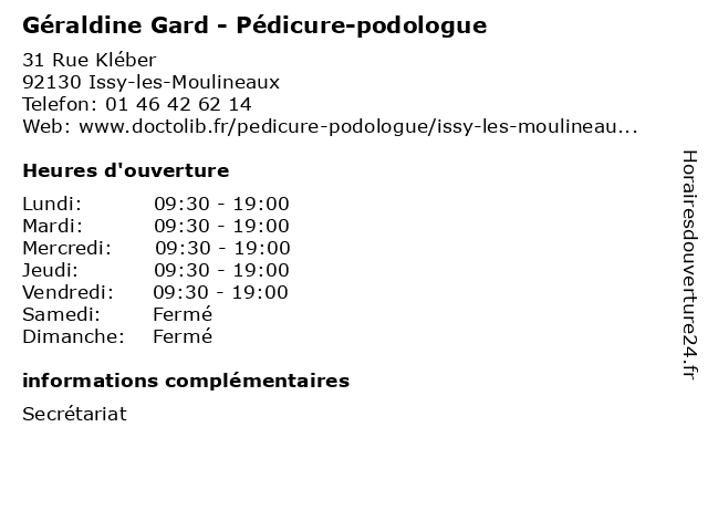 1 Johanna Phatthanasinh - Pédicure-podologue (Distance: 0,20 km) 39 Rue Danton, 92130 Issy-les-Moulineaux cheville, johanna, orteil, phatthanasinh, pied, podologue, pédicure 2 Dr Géraldine Gasman - Médecin généraliste (Distance: 0,38 km) 40 Boulevard Gambetta, 92130 Issy-les-Moulineaux docteur, dr, gasman, generaliste, généraliste, géraldine, medical, médecin, soin 3 Charlotte Ajjan - Pédicure-podologue (Distance: 1,43 km) 55 Rue Jean Jaurès, 92170 Vanves ajjan, charlotte, orthoplastie, podologue, pédicure, pédicurie 4 Didier Zerah - Pédicure-podologue (Distance: 1,88 km) 1 Avenue Pierre Grenier, 92100 Boulogne-Billancourt didier, orthoplastie, podologue, pédicure, pédicurie, zerah 5 Dr Géraldine Poirot - Pédiatre (Distance: 2,14 km) 11 place Jean Mermoz, 92320 Châtillon docteur, dr, generaliste, géraldine, medical, poirot, pédiatre, soin 6 Géraldine Tuzet - Diététicienne (Distance: 2,39 km) 202 Boulevard Jean Jaurès, 92100 Boulogne-Billancourt diététicien, diététicienne, du, géraldine, nutrition, sportif, tuzet |