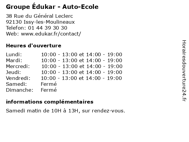 | Lundi | 10:00-13:00 et 14:00-19:00 |