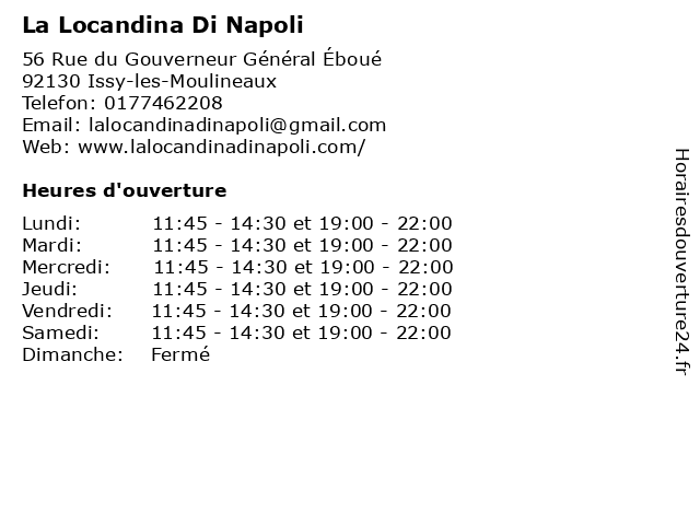 | Samedi | 11:45-14:30 et 19:00-22:00 |