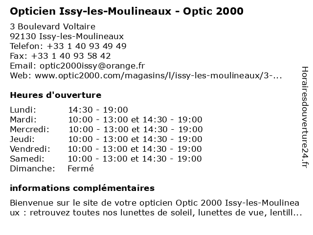 1 Optic 2000 (Distance: 0,00 km) 3 Boulevard Voltaire, 92130 Issy Les Moulineaux 2000, accessoires, lentilles, lunettes, montures, optic, optic 2000, opticien, solaire, verres, vision, vue 2 Optic 2000 (Distance: 0,47 km) 17 Rue du Général De Gaulle, 34200 Sete 2000, care, clinic, doctor, health, optic, optique, vision 5 Young Optic (Distance: 3,30 km) 4 Rue Duban, 75016 Paris care, clinic, doctor, health, optic, opticiens, optique, vision, young 6 Optic 2000 (Distance: 4,40 km) 16 Rue des Belles Feuilles, 75116 Paris 2000, accessoires, beaute&sante, cafe, chaussures, enfants, mode femmes, mode hommes, optic, optique, restaurant, service, sport |
