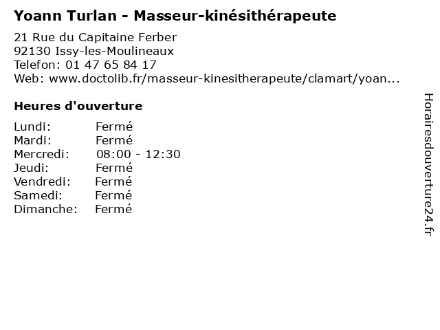 1 Yoann Turlan - Masseur-kinésithérapeute (Distance: 5,38 km) 8 Rue Serpis, 92140 Clamart docteur, kine, kinesitherapeute, kinésithérapeute, masseur, turlan, yoann 2 Dr Yoann Vu Van Tuan - Orthodontiste (Distance: 1,91 km) 61 Rue Balard, 75015 Paris consultation, docteur, dr, med, médecin, orthodontiste, traitement, tuan, van, vu, yoann 3 Dr Yoann Bohu - Chirurgien orthopédiste et traumatologue (Distance: 2,09 km) 34 avenue du Général Sarrail, 75016 Paris bohu, chirurgien, consultation, docteur, dr, et, med, médecin, orthopédiste, traitement, traumatologue, yoann 4 Yoann Zigouris (Distance: 4,23 km) 38 Avenue Henri Ginoux, 92120 Montrouge dubois, lhermont, restaurants, yoann, zigouris 5 Yoann Chanet - Masseur-kinésithérapeute (Distance: 5,70 km) 7 Boulevard Richard Wallace, 92200 Neuilly-sur-Seine chanet, docteur, kine, kinesitherapeute, kinésithérapeute, masseur, yoann 6 Dr Yoann Bohu - Chirurgien orthopédiste et traumatologue (Distance: 6,84 km) 36 Boulevard Saint-Marcel, 75005 Paris bohu, chirurgien, consultation, docteur, dr, et, med, médecin, médecine, orthopédiste, traitement, traumatologue, yoann |