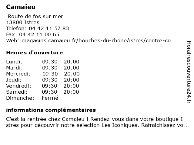 1 Camaieu (Distance: 0,94 km) - Route de Fos sur Mer, 13800 Istres accessoires, boutiques, camaieu, camaïeu, chemises, pantalons, vêtements 2 Camaieu (Distance: 18,72 km) 135 Cours victor hugo, 13300 Salon-De-Provence camaieu, magasin de chaussures, magasin de t-shirts, magasin d’accessoires de mode, maroquinerie, mode 3 Z Generation - CC LeclercChemin (Distance: 20,87 km) , St Pierre, 13700 Marignane accessories, cc, children 0-14 years, clothing, coats, dresses, generation, hoodies, jackets, jeans pants, leclercchemin, pajamas, shirts, shoes, skirts, sweatshirts, t-shirts 4 kenzo / Printemps Marseille (Distance: 37,75 km) 3 Quai du Lazaret, 13002 Marseille accessoires, chemises, enfants, hommes, jupes, kenzo, manteaux, marseille, pantalons, pour femmes, printemps, robes, sweatshirts, t-shirts et tops, tricots 5 Z Generation (Distance: 38,06 km) 13 Rue Aude, 13100 Aix-en-Provence accessories, children 0-14 years, clothing, coats, dresses, generation, hoodies, jackets, jeans pants, pajamas, shirts, shoes, skirts, sweatshirts, t-shirts 6 Kenzo (Distance: 39,60 km) 67 Rue Paradis, 13006 Marseille accessoires, chemises, enfants, hommes, jupes, kenzo, manteaux, pantalons, pour femmes, robes, sweatshirts, t-shirts et tops, tricots |