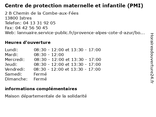 1 Centre de Protection Maternelle et Infantile (PMI) (Distance: 10,48 km) - Place des Balladins, 13140 Miramas centre, conseils, de, et, infantile, maternelle, parents, pmi, protection, prévention, puéricultrice, pédiatre 2 Centre de protection maternelle et infantile (PMI) (Distance: 10,51 km) 5 Rue de la République, 13110 Port-de-Bouc bébé, centre, de, et, infantile, maternelle, parents, pmi, protection, puéricultrice, pédiatre, vaccins 3 Centre de protection maternelle et infantile (PMI) (Distance: 11,84 km) - Rue Charles Malville, 13500 Martigues centre, conseils, de, et, infantile, maternelle, parents, pmi, protection, prévention, puéricultrice, pédiatre 4 Centre de protection maternelle et infantile (PMI) (Distance: 17,67 km) 92 Boulevard Frédéric-Mistral, 13300 Salon-de-Provence bébé, centre, de, et, infantile, maternelle, parents, pmi, protection, puéricultrice, pédiatre, vaccins 5 Centre de protection maternelle et infantile (PMI) (Distance: 19,61 km) - Rue du Stade, 13700 Marignane centre, conseils, de, et, infantile, maternelle, parents, pmi, protection, prévention, puéricultrice, pédiatre 6 |