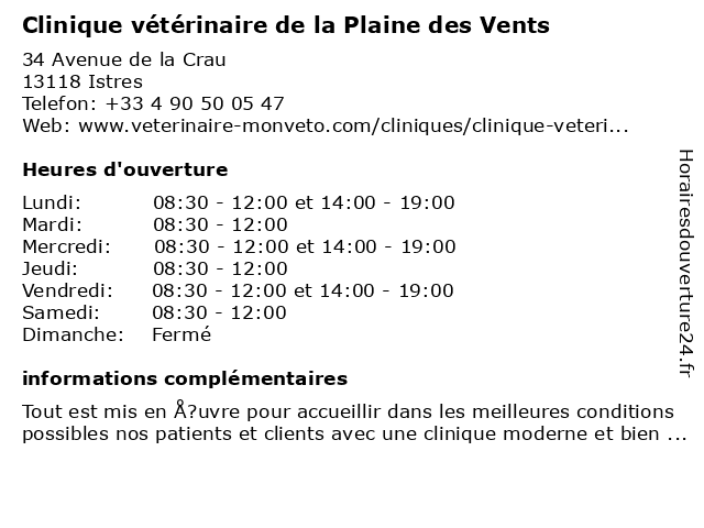 | Lundi | 08:30-12:00 et 14:00-19:00 |