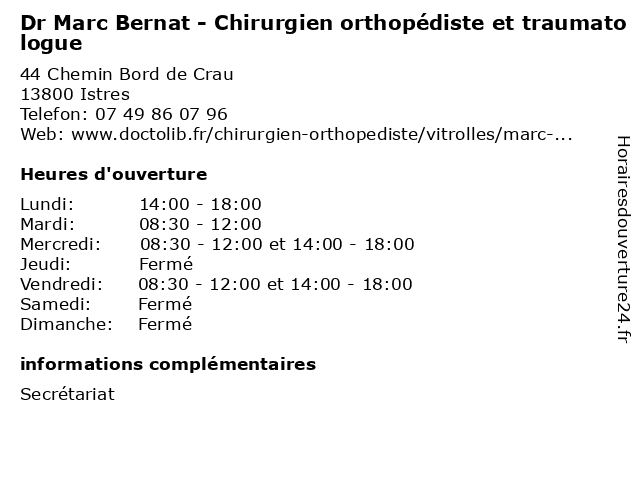 1 Marc Chabert - Ostéopathe (Distance: 0,72 km) 5 Rue Copernic, 13800 Istres chabert, marc, ostéo, ostéopathe, ostéopathes, soins 2 Dr Emmanuel Richelme - Chirurgien orthopédiste et traumatologue - secretariat (Distance: 3,06 km) 4 Rue Roger Carpentier, 13800 Istres chirurgien, dr, emmanuel, et, médecin, médecine, médical, orthopédiste, pharmaceutique, richelme, secretariat, traitement, traumatologue 3 Dr Alexandre Galland - Chirurgien orthopédiste et traumatologue (Distance: 3,06 km) 4 Rue Roger Carpentier, 13800 Istres alexandre, chirurgien, dr, et, galland, orthopedie, orthopédique, orthopédiste, trauma, traumatologie, traumatologique, traumatologue 4 Dr Éric Castel - Chirurgien orthopédiste et traumatologue (Distance: 3,06 km) 4 rue Roger Carpentier, 13800 Istres castel, chirurgien, dr, et, medecin, ortho, orthoptiste, orthopédiste, sante, traumatologue, éric 5 Dr Alexandre Baud - Chirurgien orthopédiste et traumatologue (Distance: 3,06 km) 4 Rue Roger Carpentier, 13800 Istres alexandre, baud, chirurgien, dr, et, orthopedie, orthopédique, orthopédiste, trauma, traumatologie, traumatologique, traumatologue 6 Dr. Jean-Marc Treutenaere - Radiologue (Distance: 3,08 km) - Rue Roger Carpentier, 13800 Istres consultation, docteur, dr., jean, marc, med, médecin, médecine, radiologue, traitement, treutenaere |