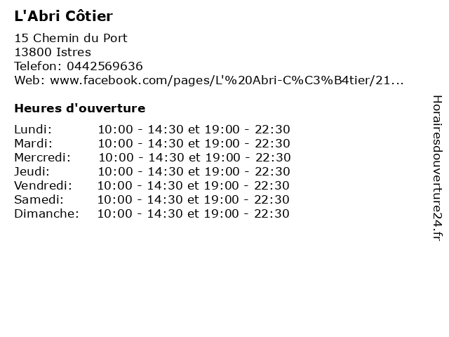 | Mardi | 10:00-14:30 et 19:00-22:30 |