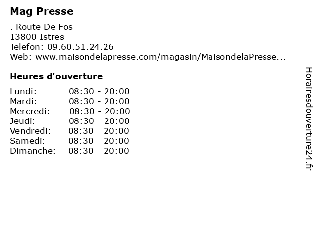 1 Mag Presse (Distance: 6,04 km) 6 Avenue Rene Cassin, 13270 Fos Sur Mer mag, magazine, presse, services 2 3 Mag Presse (Distance: 9,33 km) 15 Avenue Marius Chalve, 13140 Miramas colis, depot, kiosque, la, mag, magazines, presse, relais, tabac, toute 4 Mag Presse (Distance: 9,45 km) . Boulevard Paul Eluard, 13500 Martigues mag, magazine, presse, services 6 Mag Presse (Distance: 14,28 km) 2 Avenue Paul Langevin, 13130 Berre l'etang mag, magazine, presse, services |