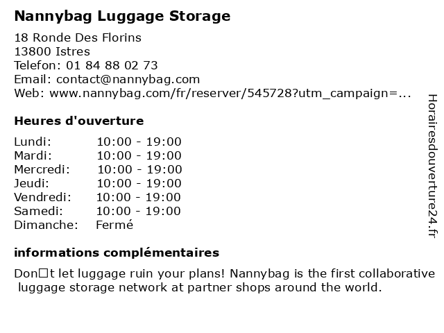2 Nannybag Luggage Storage (Distance: 13,54 km) 2a Chemin De Saint-lazare, 13500 Martigues luggage, nannybag, storage 3 Nannybag Luggage Storage (Distance: 19,56 km) 641 Chem. Du Touret, 13300 Salon-De-Provence luggage, nannybag, storage 4 Luggage Storage Salon Railway Station - Radical Storage (Distance: 18,36 km) 2 Pl. du Général de Gaulle, 13100 Salon-de-Provence luggage, luggage storage, luggage storage near me, radical, railway, salon, station, storage 5 Nannybag Luggage Storage - CLOSED (Distance: 37,95 km) 8 Rue De La Couronne, 13100 Aix-En-Provence closed, luggage, nannybag, storage 6 Nannybag Luggage Storage - CLOSED (Distance: 39,12 km) 15 Rue Puvis De Chavannes, 13001 Marseille closed, luggage, nannybag, storage |
