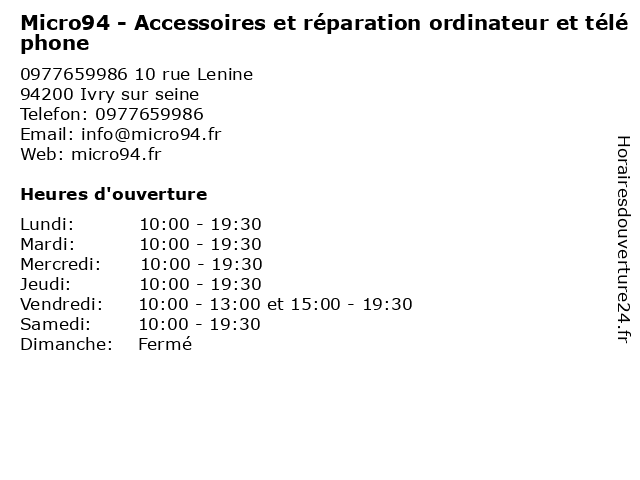 | Vendredi | 10:00-13:00 et 15:00-19:30 |