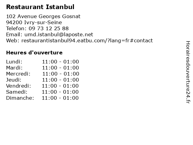1 Restaurant Istanbul (Distance: 4,30 km) 66 Rue Mouffetard, 75005 Paris hallal, istanbul, kebab, mouff, restaurant, restaurants, turc 2 Restaurant Istanbul (Distance: 4,91 km) 7 Rue Dispan, 94240 L'Haÿ-les-Roses bahar, istanbul, restaurant, restaurants 3 Restaurant Istanbul (Distance: 7,80 km) 57 Boulevard de Verdun, 94120 Fontenay-sous-Bois cuisine, istanbul, ortas, restaurant, restaurants 4 Restaurant Istanbul (Distance: 8,18 km) Erkan , 93310 Le Pre Saint Gervais erkan, istanbul, restaurant, restaurants 5 Restaurant Istanbul (Distance: 12,67 km) 60 Avenue Henri Barbusse, 91270 Vigneux Sur Seine bar, bistro, bistrot, brasserie, café, istanbul, kebab, pub, restaurant, restauration, resto, turc 6 Restaurant Istanbul (Distance: 15,43 km) 24 Place des Martyrs de Châteaubriand, 91170 Viry-Châtillon boissons, collations, istanbul, restaurant, restaurants |