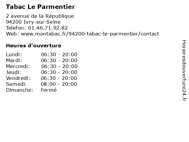 1 Tabac Le Saint Just (Distance: 0,52 km) 22 Rue Saint-Just, 94200 Ivry-sur-Seine bar, café, cigarettes, fdj, journaux, just, le, presse, saint, tabac 2 Tabac de la Gare (Distance: 0,82 km) 81 boulevard de Brandebourg, 94200 Ivry-sur-Seine bar, café, de, fdj, gare, jeux, la, presse, tabac 3 Tabac Le Jean Jaurès (Distance: 1,00 km) 28 avenue Jean Jaurès, 94200 Ivry-sur-Seine bar, café, cigarettes, fdj, jaurès, jean, journaux, le, presse, tabac 4 Tabac Le France (Distance: 1,02 km) 33 Avenue Eva Salmon, 94400 Vitry-Sur-Seine cigarette, france, hedwige, le, neuvic, papeteries, pmu, tabac 5 Tabac Les Sports (Distance: 1,25 km) 96 avenue de Verdun, 94200 Ivry-sur-Seine bar, café, fdj, jeux, les, presse, sports, tabac 6 Tabac Grand Ciel (Distance: 1,39 km) 30 boulevard Paul Vaillant Couturier, 94200 Ivry-sur-Seine bar, café, ciel, cigarettes, fdj, grand, journaux, presse, tabac |