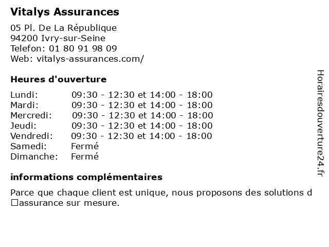 2 Vitalys Assurances (Distance: 10,56 km) 78 Rue Jean Jaurès, 93130 Noisy-le-Sec assurances, conseil en crédit, vitalys 3 VITALYS ASSURANCES (Distance: 11,25 km) 03 Avenue Charle De Gaulles, 94470 BOISSY SAINT LEGER assurances, vitalys 4 Vitalys Assurances (Distance: 12,51 km) 42 Av Henri Barbusse, 93700 Drancy assurances, conseil en crédit, vitalys 5 Vitalys Assurances (Distance: 16,50 km) 60 Rue Maurice Thorez, 92000 nanterre assurances, compagnie d'assurance titres, organisme d'assurance auto, organisme d'assurance moto, organisme d'assurance-habitation, organisme d'assurance-vie, vitalys 6 Matmut Assurances (Distance: 0,24 km) 138 bis Avenue Danielle Casanova, 94200 Ivry-sur-Seine agence d'assurance de biens, assurances, expert en sinistres, matmut, organisme d'assurance animaux de compagnie, organisme d'assurance auto, organisme d'assurance bateau, organisme d'assurance moto, organisme d'assurance-habitation, organisme d'assurance-vie, service d'assurance professionnelle |