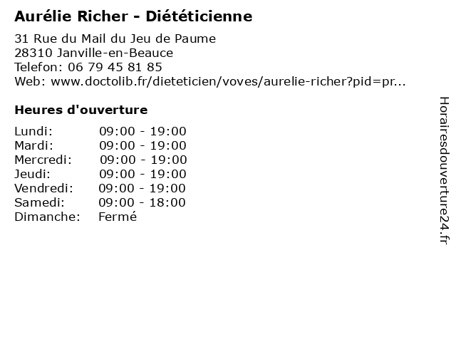 1 Aurélie Richer - Diététicienne (Distance: 20,83 km) 7 Rue du Voisin, 28150 Voves aliment, aurelie, aurélie, dieticien, diététicienne, medecin, nutrition, richer 2 Aurélie Vergnaud - Hypnothérapeute (Distance: 32,71 km) 1 Rue du Faubourg Bannier, 45000 Orléans aurelie, aurélie, hypno, hypnose, hypnothérapeute, sante, vergnaud 3 Nicolas Bordier - Diététicien (Distance: 33,16 km) 10 Rue des Maltotiers, 45000 Orléans alimentation, bordier, dieteticien, diététicien, nicolas, nourriture, sante 4 Aurélie Barra - Sage-femme (Distance: 33,52 km) 1 Rue Porte Madeleine, 45100 Orleans aurelie, aurélie, barra, consultation, docteur, dr, femme, med, médecin, sage, traitement 5 Aurélie Boureau - Sage-femme (Distance: 37,32 km) 4 rue Claude Bernard, 28630 Le Coudray aurelie, aurélie, boureau, consultation, docteur, dr, femme, med, médecin, sage, traitement 6 Aurélie Moulin - Psychologue (Distance: 40,36 km) 16 Rue du Massacre, 28000 Chartres aurelie, aurélie, folie, moulin, psychiatre, psychiatrie, psychiatrique, psychologue |