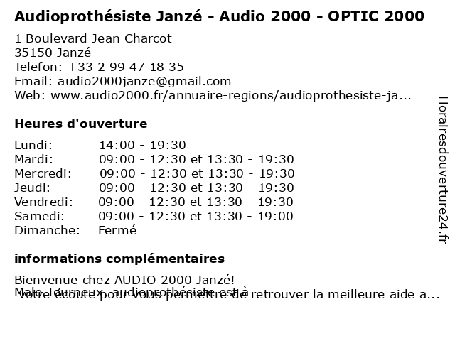 1 Opticien Janzé - Optic 2000 (Distance: 0,01 km) Boulevard Jean Charcot, 35150 Janzé 2000, janzé, lentilles de contact, lunettes de soleil, lunettes de vue, optic, optic2000, opticien, opticien optic2000, ray-ban, rayban 3 Opticien Chantepie - Optic 2000 (Distance: 17,56 km) 46 Avenue André Bonnin, 35055 Chantepie 2000, chantepie, lentilles de contact, lunettes de soleil, lunettes de vue, optic, optic 2000 chantepie, optic2000, opticien, opticien optic2000, ray ban, ray-ban 4 Opticien Châteaubourg - Optic 2000 - Avenue de la Bretonnière ZAC des Jardins de (Distance: 18,26 km) Avenue de la Bretonnière, 35220 Châteaubourg 2000, avenue, bretonnière, châteaubourg, de, des, jardins, la, lentilles de contact, lunettes de soleil, lunettes de vue, optic, optic2000, opticien, opticien optic2000, ray-ban, rayban, zac 5 Amplifon Audioprothésiste Bain Optic (Distance: 18,56 km) 27 Rue des estuaires, 35470 Bain de Bretagne amplifon, audiologie, audioprothésiste, bain, optic 6 Bain Optic (Distance: 18,72 km) 27 rue des Estuaires, 35470 Bain de Bretagne bain, lentilles, lunettes, optic, opticien, progressif, solaires, verre, vue |