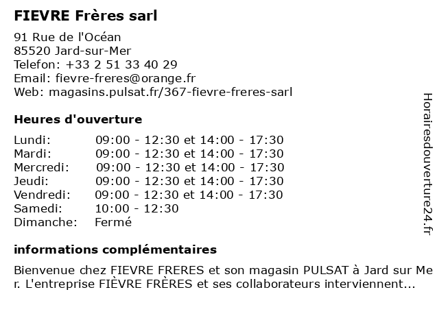 1 Jutard Frères Maçonnerie (Distance: 8,55 km) . L'Éraudière, 85440 Avrillé construction, couverture, frères, jutard, maçonnerie, rénovation 3 Boucherie Arnaud Frères (Distance: 22,21 km) 11 Grande Rue, 85430 Aubigny arnaud, boucherie, boucheries, freres, frères, poissonneries 4 Top Garage - Garage Davy Frères (Distance: 23,66 km) - Route départementale 735, 17590 Ars-en-Ré automobiles, davy, euro, freres, frères, garage, location de voiture, location de véhicules, motos, repar, top 5 Restaurant Aux Frères De La Côte (Distance: 23,71 km) 5793 Route de la Grange, 17590 Ars en Ré aux, côte, de, frères, la, restaurant, ré 6 Cousseau Frères (Distance: 30,46 km) 102 rue de la Boulaye, 85320 Mareuil-sur-Lay-Dissais charpente, cousseau, fermetures, frères, menuiserie, rénovation, vitrerie |