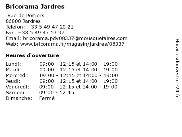 1 Bricorama Jardres (Distance: 0,36 km) - Za la Carte, 86800 Jardres bricorama, jardres, magasin, matériaux 2 Bricorama (Distance: 32,31 km) 3 Rue Gaspard Monge, 36300 Le Blanc brico, bricorama, decoration, jardin, mobilier |