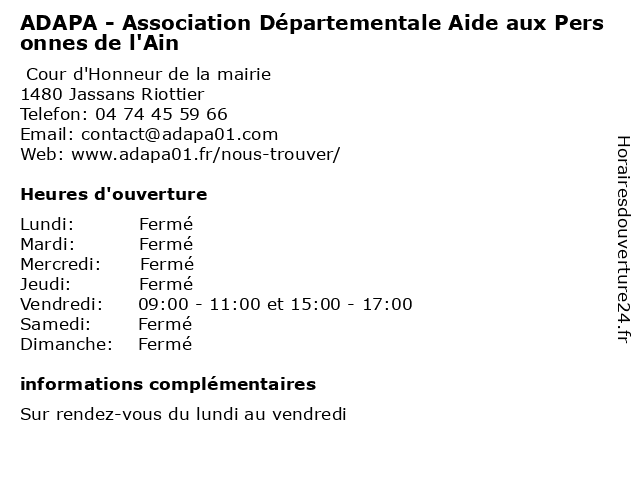 1 ADAPA - Association Départementale Aide aux Personnes de l'Ain (Distance: 4,95 km) Rue des Bois, 01600 Trevoux accompagnement, adapa, aide, association, aux, auxiliaire, course, de, domicile, départementale, femme, l'ain, ménage, personnes, sociale 3 Marché Aux Affaires (Distance: 3,05 km) 177 Rue Grenette, 69400 Villefranche-sur-Saône accessories, affaires, aux, basketry, christmas, cosmetics, household, hygiene, marché, paintings, stationary, toys, wool 4 Association de Chiens Guides d'Aveugles - Lyon et Centre Est (Distance: 3,12 km) 162 Avenue Edouard Herriot, 01600 Misérieux association, centre, chiens, d'aveugles, de, du, entité, entreprise, est, et, guides, lyon, société 5 Aux Pieds Sensibles (Distance: 3,28 km) 223 rue Nationale, 69400 Villefranche-sur-Saône accessoires, aux, chaussures, femme, magasin, pieds, sacs, sensibles 6 Agence Départementale d'Information sur le Logement (ADIL) (Distance: 3,39 km) 20 Rue Claude-Bernard, 69400 Villefranche-sur-Saône adil, administration, agence, assoc, d'information, départementale, le, logement, services, services publics, sur |