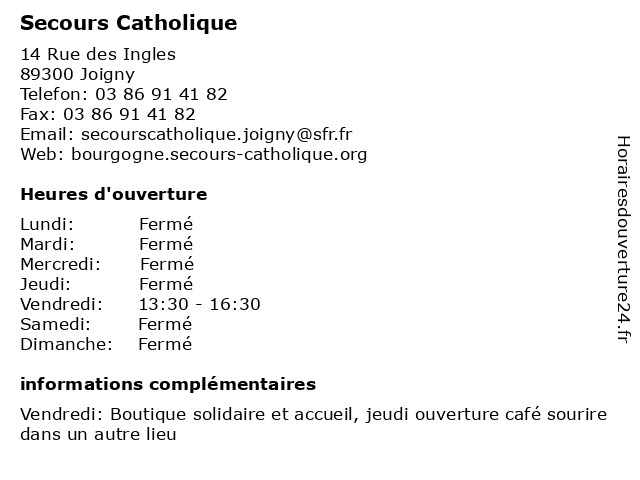 1 Secours Catholique - Boutique Solidaire (Distance: 0,00 km) 14 Rue des Ingles, 89300 Joigny associatif, association, boutique, bénévolat, bénévole, catholique, secours, solidaire, solidarité 2 Centre de secours Joigny - SDIS 89 (Distance: 1,30 km) - Chemin du Petit Tuot, 89300 Joigny 89, centre, de, joigny, lutte contre les incendies, pompier, protection, prévention, sdis, secours 3 Jussieu Secours Joigny (Distance: 1,36 km) 51 bis Avenue Charles de Gaulle, 89300 Joigny joigny, jussieu, secours 4 Centre de secours Migennes - SDIS 89 (Distance: 8,26 km) 9 avenue Jean Jaurès, 89400 Migennes 89, centre, de, lutte contre les incendies, migennes, pompier, protection, prévention, sdis, secours 5 Centre de secours Saint-Julien-du-Sault - SDIS 89 (Distance: 9,87 km) 33 avenue Pasteur, 896330 Saint-Julien-du-Sault 89, centre, de, du, julien, lutte contre les incendies, pompier, protection, prévention, saint, sault, sdis, secours 6 Centre de secours Aillant-sur-Tholon - SDIS 89 (Distance: 12,37 km) 17 rue des Blues, 89110 Aillant-sur-Tholon 89, aillant, centre, de, lutte contre les incendies, pompier, protection, prévention, sdis, secours, sur, tholon |