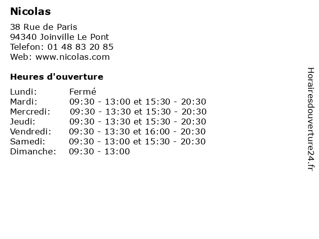 1 Nicolas (Distance: 0,85 km) 32 Avenue du Gal Gallieni, 94340 Joinville Le Pont champagnes, hyper-supermarchés, nectars, nicolas, vente au détail de vin, vin 2 Nicolas (Distance: 6,48 km) 234 Boulevard du Mont d'Est, 93193 Noisy-le-Grand alimentation, beauté & santé, culture & loisirs, enfants, high-tech, maison & déco, mode, nicolas, restaurants 3 Nicolas (Distance: 7,30 km) 98 Boulevard Masséna, 75013 Paris beaute, cafe, chaussures, enfants, lingerie, mode femmes, mode hommes, nicolas, restaurant, sport 4 Nicolas (Distance: 8,75 km) 122 Rue Jean Jaures, 93130 Noisy-le-Sec champagnes, hyper-supermarchés, nectars, nicolas, vente au détail de vin, vin 5 Nicolas (Distance: 8,79 km) 120 Boulevard Richard Lenoir, 75011 Paris hyper-supermarchés, nicolas, vente au détail de vin, vin 6 Nicolas (Distance: 8,84 km) 30 Boulevard Voltaire, 75011 Paris champagnes, hyper-supermarchés, nectars, nicolas, vente au détail de vin, vin |