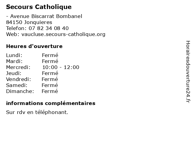 1 Secours Catholique (Distance: 2,41 km) 12 Place de l’Eglise, 84350 Courthézon accueil, association, catholique, organisation, secours 2 Secours Catholique (Distance: 6,63 km) 36 Avenue de Verdun, 84100 Orange accueil, association, catholique, organisation, secours 3 Secours Catholique (Distance: 11,44 km) 18 Rue du Château, 84700 Sorgues accueil, association, catholique, organisation, secours 4 Secours Catholique (Distance: 13,21 km) 56 Rue du Barquet, 84420 Piolenc accueil, association, catholique, organisation, secours 5 Secours Catholique (Distance: 13,32 km) 36 Rue des Frères Laurens, 84200 Carpentras accueil, association, catholique, organisation, secours 6 Secours Catholique (Distance: 14,25 km) - Avenue Kimmerling, 84290 Sainte-Cécile-les-Vignes accueil, association, catholique, organisation, secours |